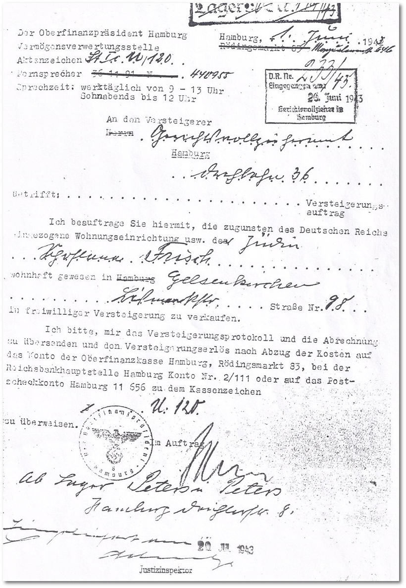 vom 8. Juli 1941. Mit dem Schreiben wurden die Hauptzollämter angewiesen, auch das bei den Speditionen eingelagerte und unter Zollverschluss zurückgehaltene »Umzugsgut den Stapo(leit)stellen zum Zwecke der Versteigerung freizugeben«. So wurde auch eine Kiste Umzugsgut (Hausrat u. Bekeidung), Gewicht 187 Kg aus dem Besitz der Jüdin Schoschana Frisch, letzte Anschrift: Gelsenkirchen, Bismarckstr. 98 - penibel hielt der versteigernde Hamburger Gerichtsvollzieher Gerlach in einer sechsseitigen Auflistung den Erlös einzelner Gegenstände sowie die Namen der Käufer fest.