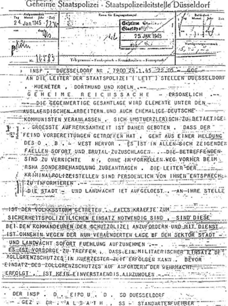 Abb. 4: Fernschreiben Dr. Walter Albath (SS-Standartenführer u. Inpekteur der Sicherheitspolizei und SD im Wehrkreis VI) vom 14. Januar 1945 an die Leiter der Stapo-Leitstellen Düsseldorf, Münster, Dortmund und Köln: "(...) Es ist in allen sich zeigenden Fällen sofort und brutal zuzuschlagen. Die Betreffenden sind zu vernichten, ohne formellen Weg vorher beim RSHA Sonderberhandlung zu beantragen. Die Leiter der Kriminalpolizeistellen sind persönlich von ihnen zu informieren. (...) (Zum Vergößern anklicken)
