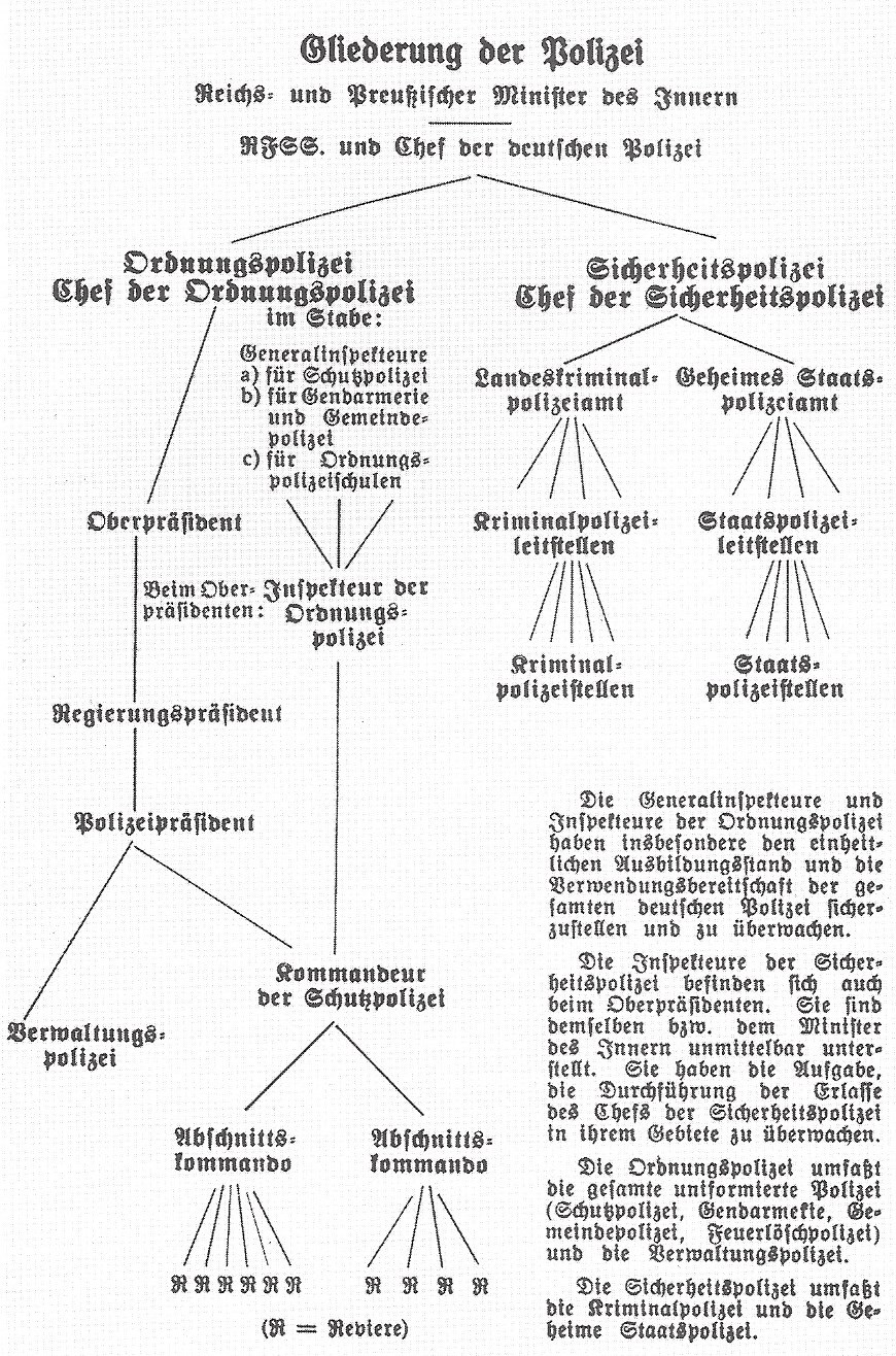 Abb. 3: Gliederung der Polizei, 1940. In den letzten Jahren des zweiten Weltkrieges wurden insbesondere Geheime Staatspolizei (Gestapo) und Kriminalpolizei (Kripo) mehr und mehr zum Instrument des Terrors von Innen. (Zum Vergößern anklicken)