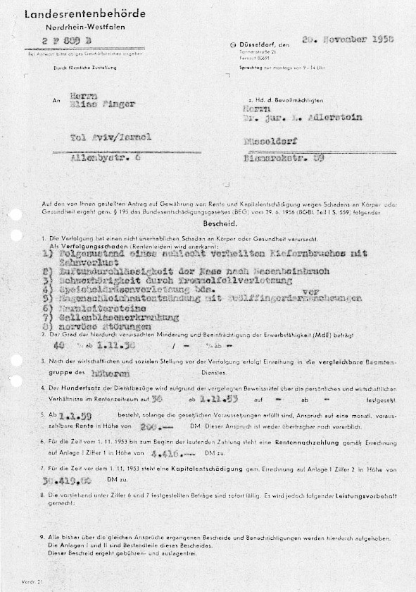Mitte der 50er Jahre stellte Elias Finger beim Gelsenkirchener "Wiedergutmachungsamt" einen Antrag auf Entschädigung für den erlittenen Freiheitsschaden. 1962 wird über den Antrag entschieden. Die Entscheidung wirft ein bezeichnendes Licht auf die seinerzeit gängige Entschädigungspraxis: Die Behörde erkennt lediglich die Haft im "Reichsgebiet" an, für diese 6 Monate Freiheiheitsentzug erhielt Elias Finger 900 DM. Elias Finger starb am 29. Januar 1964 in Tel Aviv, er wurde auf dem dortigen Kiryat Shaul Cemetery, Meir Binet Street beigesetzt.
