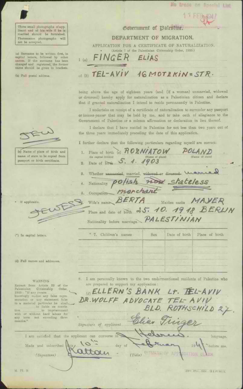Abb.6: Einbürgerungsurkunde Palästina für Elias Finger und Ehefrau Berta, geborene Mayer, 1947