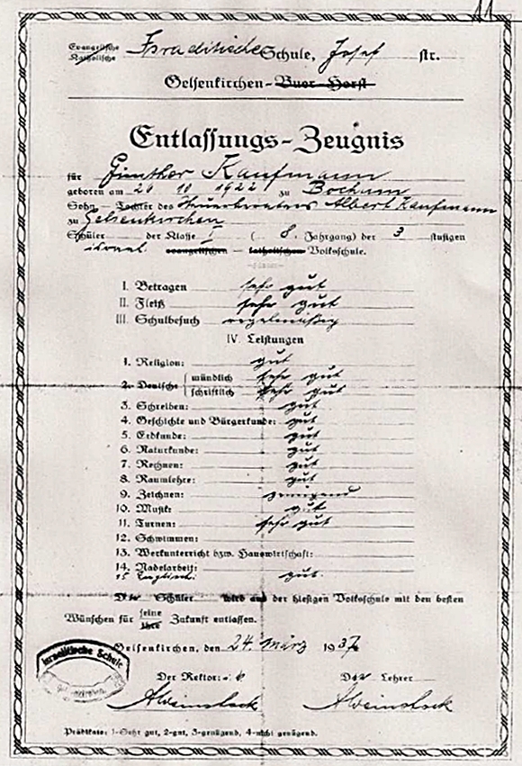 Abb. 3: Entlassungszeugnis 1937 der Israelitischen Schule Josefstrasse Gelsenkirchen für Günther Kaufmann vom 24. März 1937. (Zum Vergrößern anklicken)