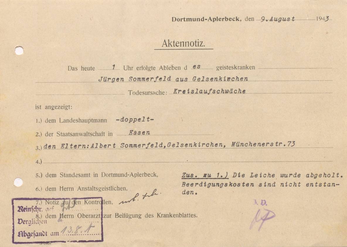 Am 9. August 1943 ist das Kind tot, gestorben um 1 Uhr angeblich an "Kreislaufschwäche", so steht es auf dem Totenschein. Die Eltern in Gelsenkirchen wurden vom "Tod" ihres Kindes informiert, der Vater machte sich daraufhin mit einem Pferdefuhrwerk auf den Weg nach Dortmund-Aplerbeck und holte den Leichnahm ab. Jürgen Sommerfeld wurde in Gelsenkirchen-Schalke auf dem evangelischen Friedhof "Am Rosenhügel" beigesetzt.