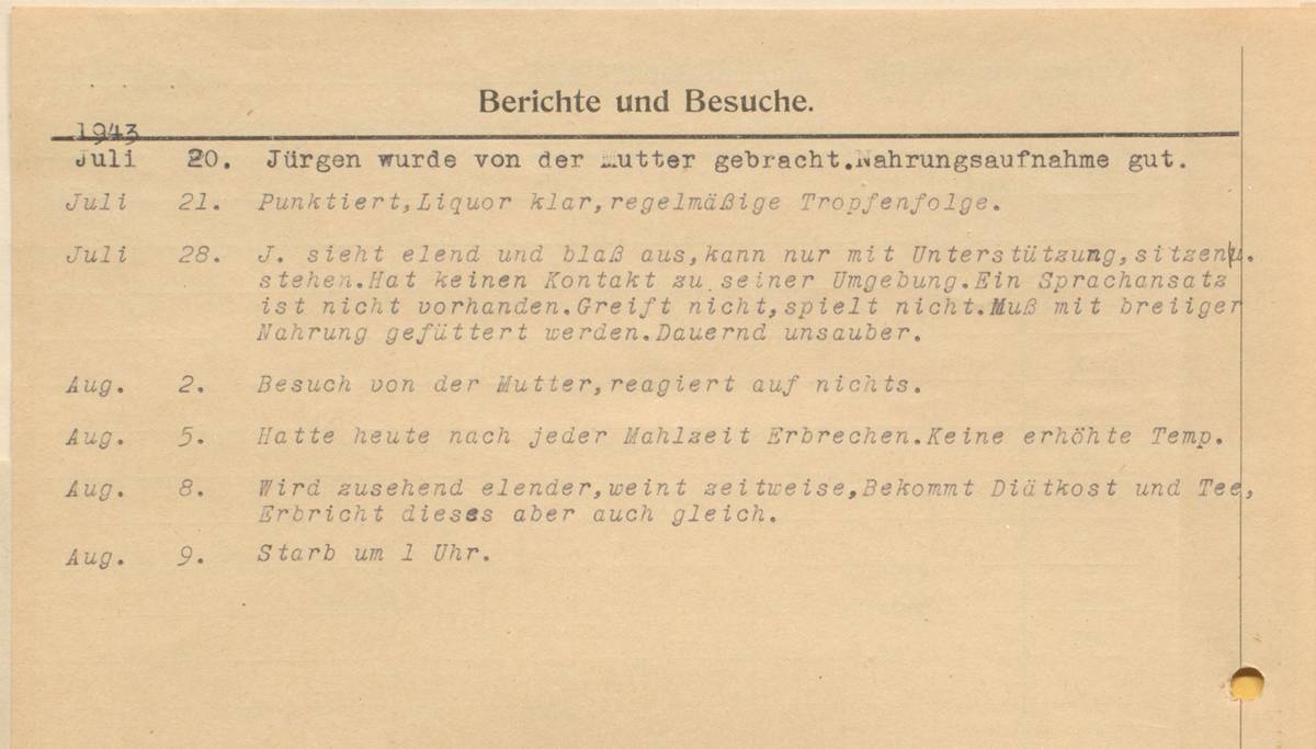 Die Zustimmung der Eltern, die offiziell Voraussetzung für die Tötung der Kinder war, wurde auf sehr zweifelhafte Weise eingeholt, meist wussten die Eltern nicht, was ihre Kinder erwartete. Die Bezeichnung „Kinderfachabteilung“ sollte bewusst den wahren Zweck der Einrichtungen vertuschen. Das wird auch Jürgens Mutter nicht gewusst haben, die den kleinen Jungen selbst von Gelsenkirchen nach Aplerbeck brachte. In der Patientenakte findet sich dann auch die Einverständniserklärung der Mutter, die mit ihrer Unterschrift bestätigte, dass sie mit einer Röntgenaufnahme des Schädels und der Entnahme von Nervenflüssigkeit (Liquor) bei ihrem Sohn einverstanden ist.
