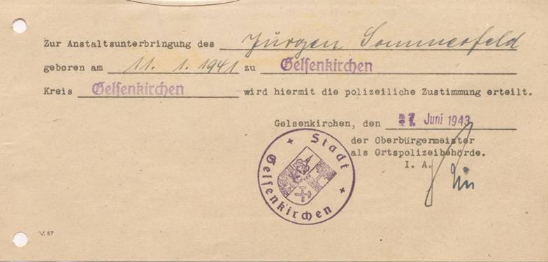 Jürgen Sommerfeld, geboren am 11. Januar 1941 in Gelsenkirchen war ein behindertes Kind. Er war gerade zweieinhalb Jahre alt, als er am 20. Juli 1943 in die so genannte "Kinderfachabteilung" der Provinzialheilanstalt Aplerbeck in Dortmund aufgenommen wurde. Natürlich wusste der kleine Junge nicht, dass sich hinter dem Begriff "Kinderfachabteilung" eine Mordanstalt verbirgt, in der Kinder begutachtet und die so zur Tötung ausgewählten Kinder zeitnah umgebracht wurden.