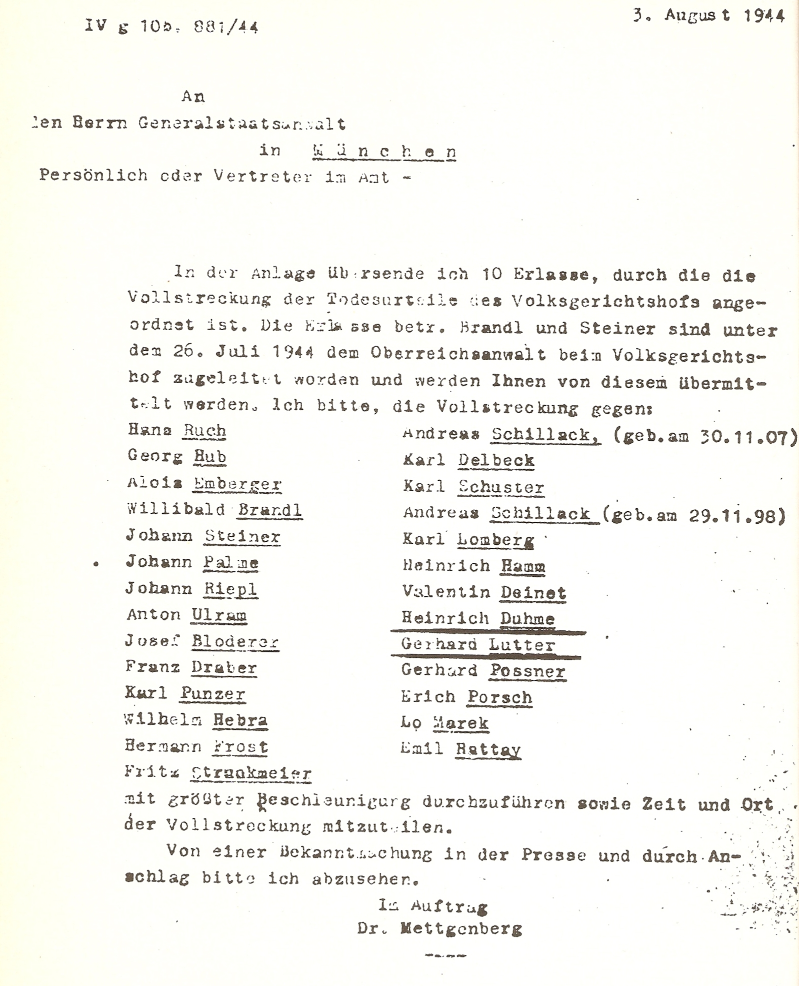 Abb. 3: Vollstreckungsanordnung des Todesurteils gegen Angehörige der Widerstandsgruppe Zielasko