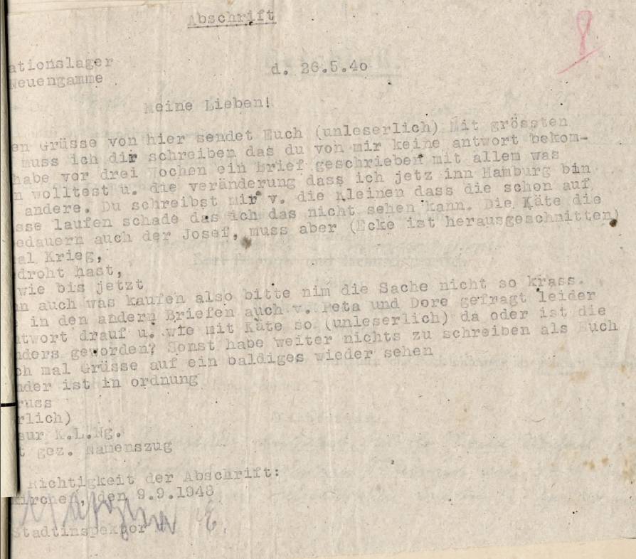 Abb. 2: Abschrift eines Briefes, den Michael Hojnacki am 26. Mai 1940 aus dem KZ Neuengamme an seine Familie in Gelsenkirchen geschrieben hat.