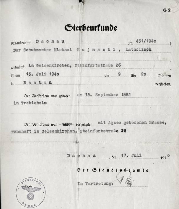 Michael Hojnacki wurde von einem Nachbarn bei den NS-Behörden denunziert, verhaftet und in das Gefängnis Gelsenkirchen gebracht. Der Name des Denunzianten war bekannt, ihm geschah jedoch nach dem Krieg bis auf eine Tracht Prügel nichts.[3] Vom Gelsenkirchener Gefängnis wurde Michael Hojnacki am 22. November 1939 in das KZ Sachsenhausen verbracht, dann weiter in das KZ Neuengamme (Hamburg) verschleppt und am 22. Juni 1940 in das KZ Dachau verlegt. Dort starb Michael Hojnacki am 15. Juli 1940 unter ungeklärten Umständen. Zeitgleich mit seinem Leidensweg befanden sich seine beiden Söhne als Soldaten im 2. Weltkrieg, der jüngste Sohn ertrank jämmerlich in einem U-Boot.[4]