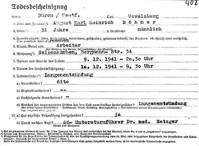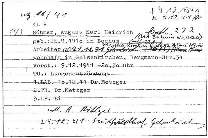 Karl Böhmer wurde am 10. Februar 1941 in das zu diesem Zeitpunkt noch organisatorisch als Aussenkommando des KZ Sachsenhausen geführte "Schutzhaftlager" in Wevelsburg eingeliefert (Am 15. Oktober 1941 wurde die endgültige Bezeichnung "Konzentrationslager Niedernhagen" festgelegt). Karl Böhmer starb am 9. Dezember 1941 im KZ Niedernhagen (Wewelsburg) - angeblich an Lungenentzündung. Nach Tod ihres Mannes musste Anna Böhmer in Gelsenkirchen allein für sich und ihre neun Kinder sorgen, war um so mehr auf die Fürsorgeunterstützung durch die Stadtverwaltung angewiesen. [7]