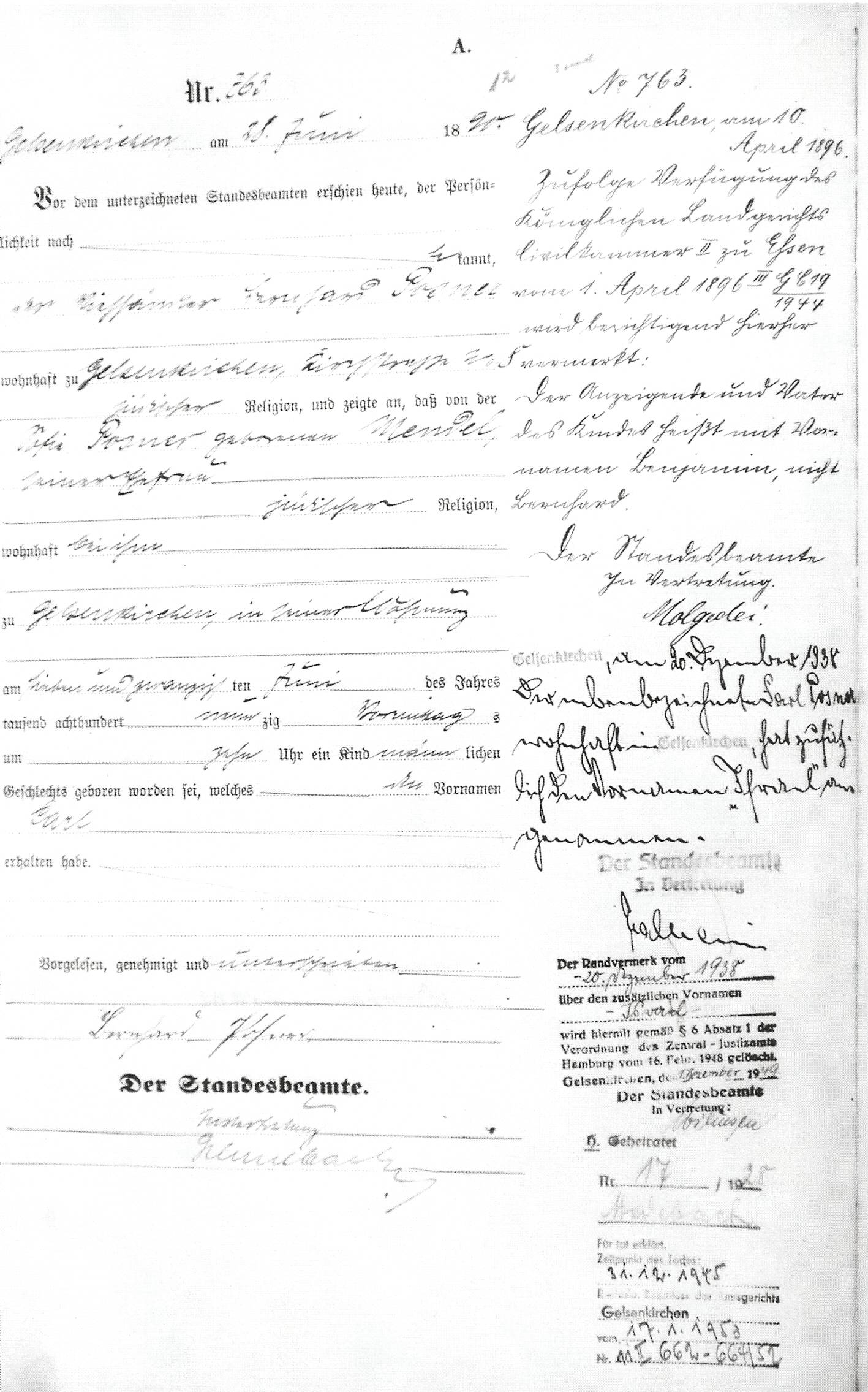 Abb. 3: Randvermerke des Standesamts Gelsenkirchen auf der Geburtsurkunde von Carl Posner: Der von den Nazis angeordnete Zwangsvorname "Israel" wird gelöscht