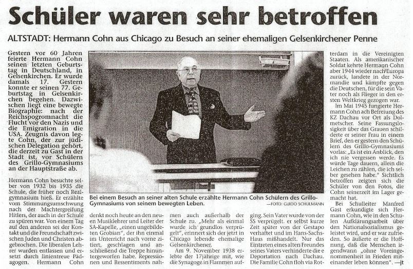 Am Nachmittag des 10. November 1938 war ich wieder in Gelsenkirchen, von Vater kein Lebenszeichen. Doch dann bekamen wir einen Anruf, er befand sich in einem Krankenhaus in Essen. In Gelsenkirchen wollte keiner helfen, weil er Jude war jeder ihn kannte. Irgend jemand hat in nach Essen ins Krankenhaus gebracht, wir wissen bis heute, nicht wer das war. Nach einer gewissen Zeit konnte er dann wieder nach Hause. Wir wussten nun, dass es wirklich allerhöchste Zeit war, Deutschland zu verlassen. Walter war ja schon mit Kindertransport weg, er war schon in Chicago. Meine Eltern drangen darauf, das es auch für mich soweit war: "Hermann, sie verhaften Jungen in deinem Alter, einfach so, von der Straße weg. Die werden nie wieder gesehen. Du kannst nicht länger bleiben!" Damals war ich war siebzehn, sie schafften es, mir einen Platz in einem Kindertransport nach Holland zu sichern, einer der letzten Transporte für unter 18jährige. Zuvor musste ich jedoch meine Papiere haben, Bescheinigungen, dass die Sozialversicherungen und alle Steuern bezahlt sind, um Deutschland verlassen zu können, durfte ein Jude keine Schulden beim Staat oder sonst wo haben. Also machte ich mich auf dem Weg zum Finanzamt und zur Allgemeinen Ortskrankenkasse (AOK)